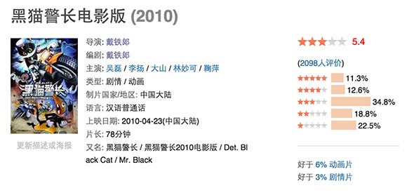 实际上在2010年的时候,《黑猫警长》就已经出过电影,这是《黑猫警长》大电影计划中的第一部,其中的内容都是原先播放过的5集中出现过的内容。但在豆瓣电影的评价并不是很高,平均分也只有5.4分,被人戏称为“其实这是一部有关美食的系列故事”和“恐!怖!片!”所以严格算来,现在所谓的“30年再相见”其实应该是“5年后又见”,不过第二部的情节超出了1984版的5集,而是新的故事情节。