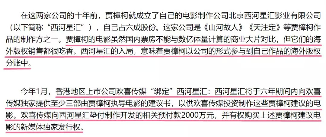 而成立后的北京西河星汇影业有限公司不仅主出品贾樟柯《山河故人》《江湖儿女》等影片,而且还分别投资了韩杰的《Hello!树先生》与新人导演权聆的《忘了去懂你》等文艺片。