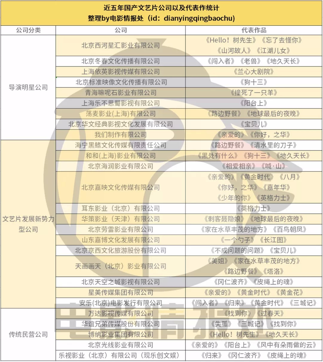 从近两年的市场发展态势来看,国产文艺片市场正呈现出一派欣欣向荣,同时文艺片背后的参与方、资本局等也呈现出新的变化,对此,电影情报处主要针对市场上文艺电影成绩优秀的代表公司进行梳理,并将这些公司大致分为创作者导向公司、文艺片发展新势力型公司以及传统民营公司这三类。