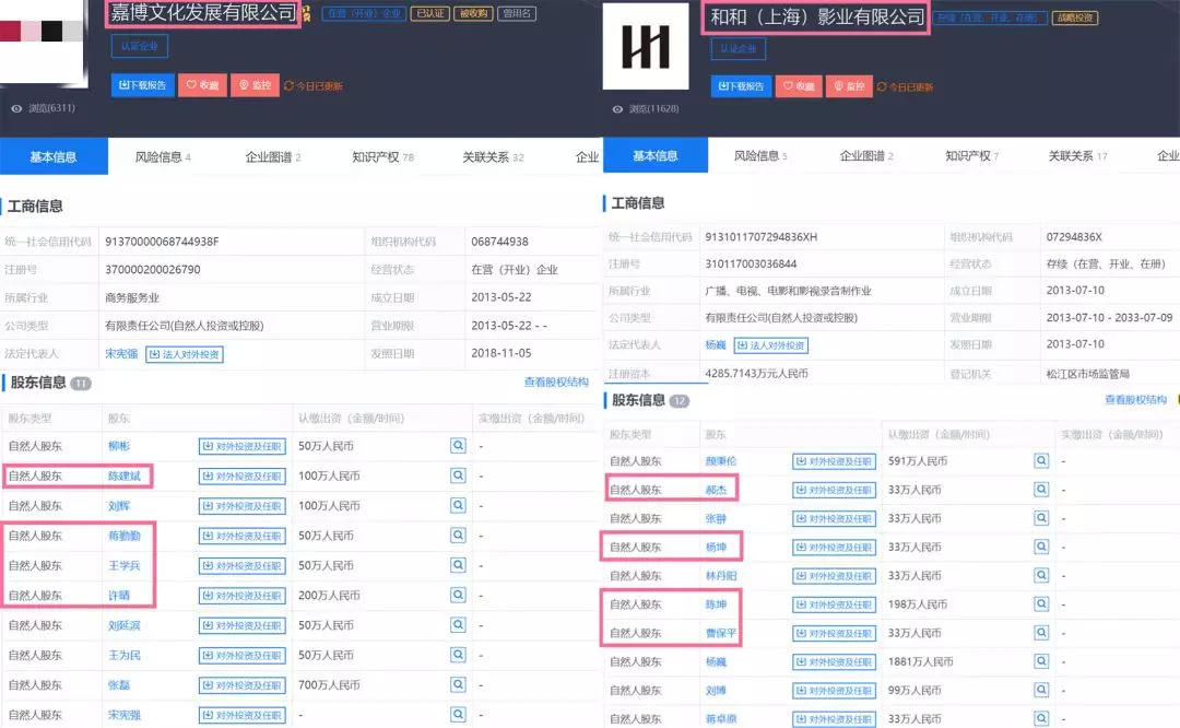 其它诸如山东嘉博文化发展有限公司与和和(上海)影业有限公司也有着类似属性,山东嘉博文化发展有限公司是《一个勺子》《长江图》的出品方,其中陈建斌、蒋勤勤和王学兵等人也是这家公司的股东之一;和和(上海)影业有限公司是《黑处有什么》《狗十三》《地久天长》等影片的出品方,其中导演曹保平、郝杰以及演员杨坤等明星均是其股东。