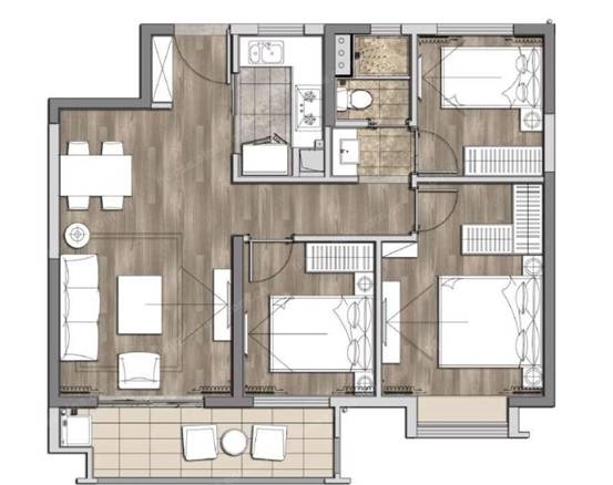 这是94平米的户型,为3室2厅1卫设计。户型较为方正,独立主卧,有专享衣帽间,给与主人更多的隐私空间;大尺度瞰景阳台,揽景入室,延伸家居空间,更好的畅想生活;方正双厅设计,让空间设计更加合理;玄关设有储物间,可以安置杂物,让收纳更省心。