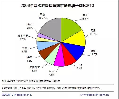 此时,腾讯、网易已经占据了大部分市场。2008年到2013年这五年间,游戏市场风云变幻,具有互联网基因的腾讯、网易在网络游戏的运营和渠道上明显更具优势,巨人网络和盛大游戏的市场慢慢被吞噬。