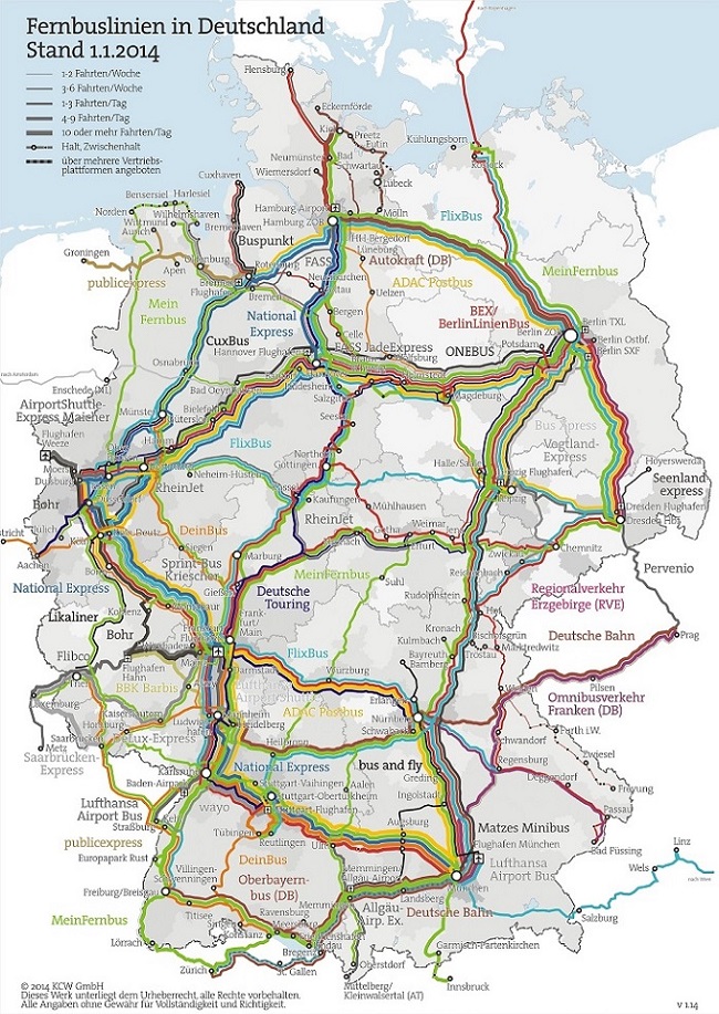 到了2013年6月,它就已拥有贯穿德国国内85个城市,以及德国周边7个城市的21条客运线路。在一些规模较大的城市,它甚至还设置了多个车站提供便利。