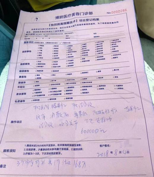 丁女士举证(摘要):1、一张相片显示:“博妍医疗”与“绮美健康产业”的字样出现在同一面墙壁上(下图1);2、一段录音中有:“注射的产品是自己配制的”内容;3、一段录音中有“由于是合作机构介绍的,所以不能开发票”;4、一张照片(下图2)显示:博妍医疗美容门诊部抬头的“项目登记档案”内的操作项目栏内有手写的价格60万元,备注栏内有“3个月内可补差价做168万”。