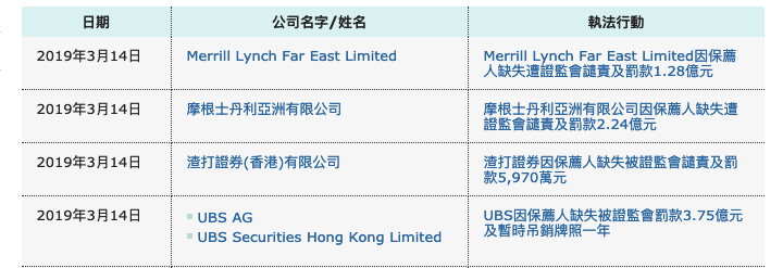 3月14日,香港证监会对瑞银集团(UBS)旗下瑞士联合银行集团(UBS AG)及瑞银证券香港公司(统称为UBS)作出谴责,并处以3.75亿港元罚款。原因是UBS在担任三宗上市申请的其中一名联席保荐人时没有履行其应尽的责任。