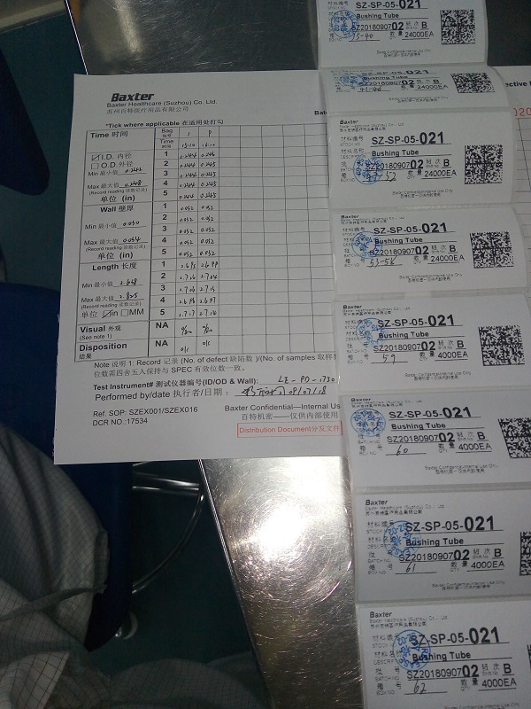 首先是在线检测仪CPK记录造假,据介绍,在线检测仪是一条生产线上监测产品质量的仪器,根据黄先生展示的一张苏州百特医疗用品有限公司编号为1802007的CPK检查表(图1)显示,2018年9月2日18时30分监测的一批1599个产品的内径CPK制程能力指数为1.68。但黄先生表示,该表为自己手工填写,记录当天二号生产线上输液管产品数据,该数据本为1.0828,自己手工记录为1.08,被记录员陈克难修改为1.68。