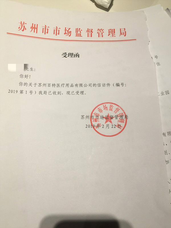 但黄先生表示,2019年1月18号苏州食药监才邮寄1月8号的告知函,超出了行政复议的时间,因此今年1月底他又向国家药监局等部门进行举报,并开始在网上发帖实名举报,据其表示,在进过互联网实名举报后,在2月25日接到国家药监局电话和苏州食药监电话。“国家药监局让我把材料整理好去江苏省食品药品监督管理局”,苏州食药监则告知黄先生“已开始对此事进行调查,次日黄先生收到苏州市市场监督管理局于2月22日出具的《受理函》(图10),称已收到他的关于苏州百特的信访件,现已受理。