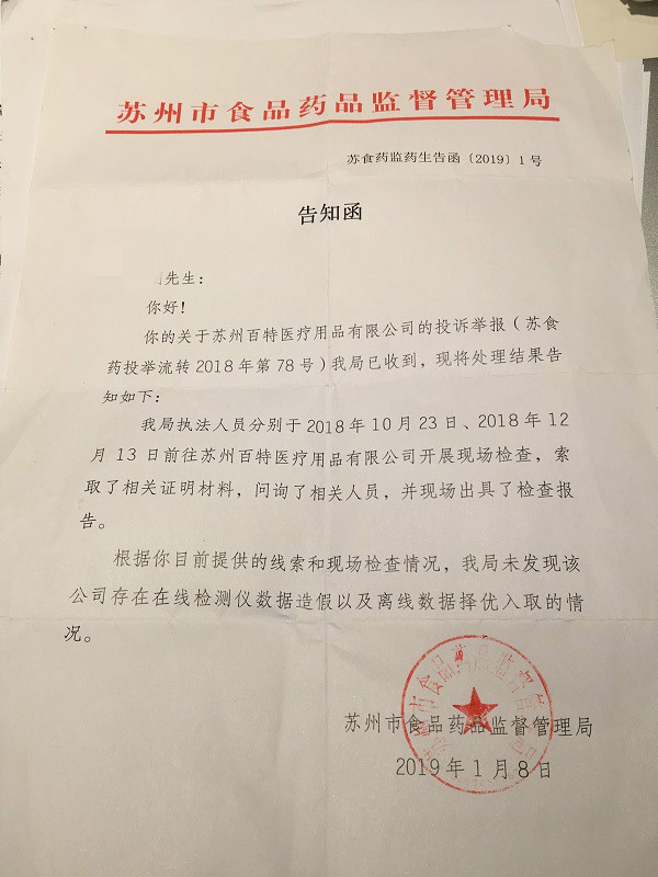 黄先生也确认,自己曾在2018年10月13日向苏州市食品药品监督管理局(“苏州食药监”)进行举报,而苏州食药监在2018年12月28号电话告知其苏州百特没有造假。苏州食药监于2019年1月8日出具的一份告知函(图9)表示,已收到黄先生的投诉举报,“我局执法人员分别于2018年10月23日,2018年12月13日前往苏州百特医疗用品有限公司进行现场检查索取了相关证明材料,问询了相关人员,并现场出具了检查报告。根据你目前提供的线索和现场检查情况,我局未发现该公司存在在线检测仪数据造假以及离线数据择优录取的情况。”