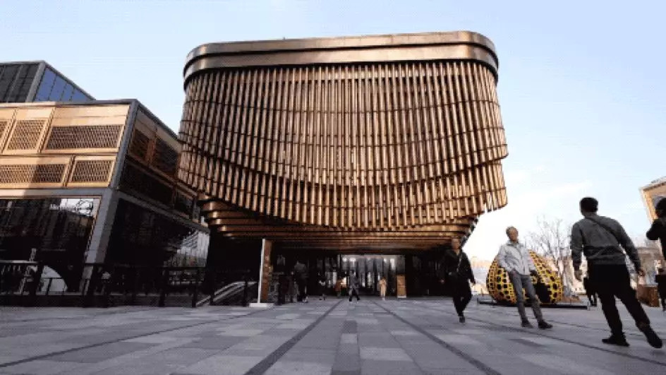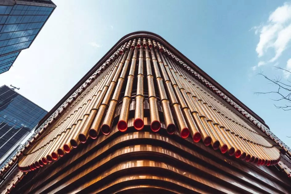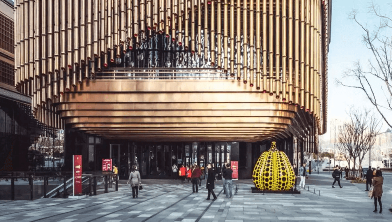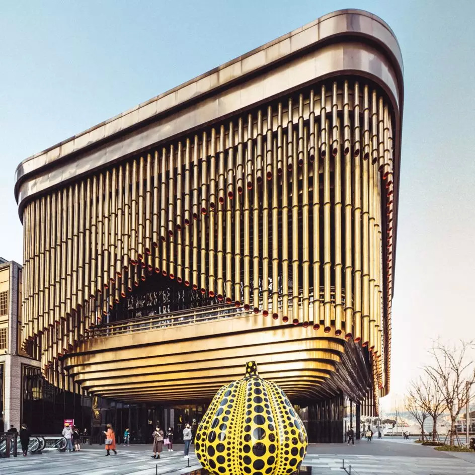 上海复星艺术中心的建筑由英国建筑设计事务所 Foster+Partners 和 Heatherwick Studio联合设计。建筑外立面由三层金色可转动帘幕组成,每两小时会转动一次。