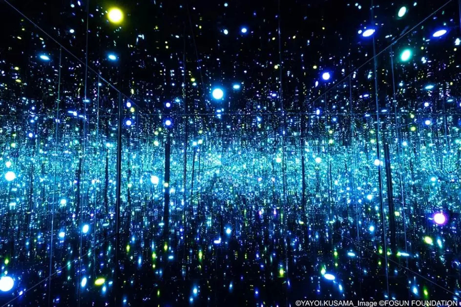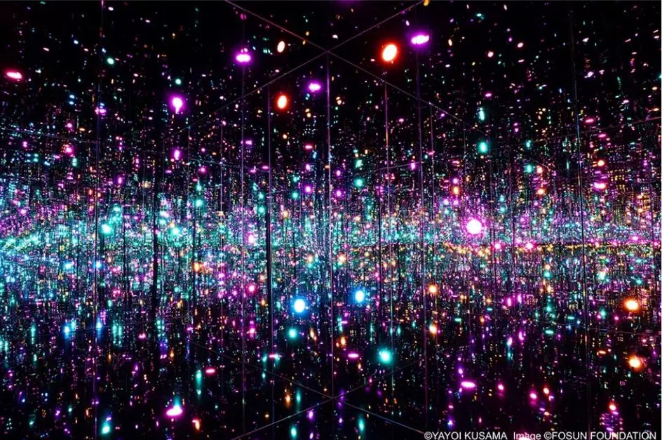 “无限镜屋”是她标志性的作品之一。从1965年创作出首个后“无限镜屋”之后,这个充满重复与光点的小屋就成了她个展的吸睛杀气。尽管在装置中每人只能呆四十五秒,但有数十万人为它排队。