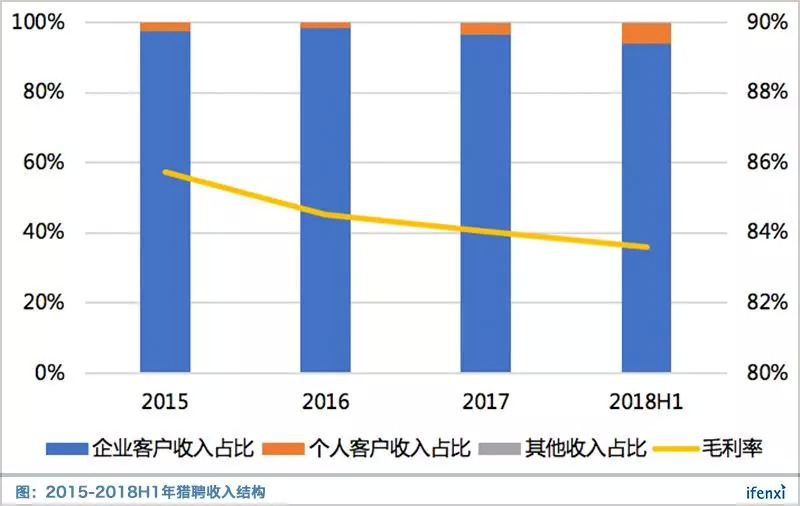 在财务表现上,猎聘的收入来自两方面,向企业客户提供人才获取服务与向个人客户提供增值服务。其中企业客户是为猎聘贡献收入的主力,2015-2018H1占比均超过96%,而随着2017年针对求职者的简历顾问产品推出,个人客户收入占比逐渐提高。