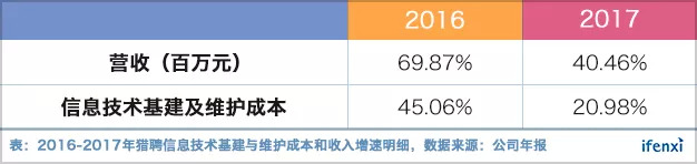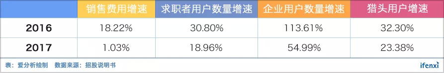 值得关注的是,2016-2017年间猎聘信息技术基建及维护成本增速小于收入增速,显示出以线上业务为主的猎聘已经逐渐形成规模效应。特别的,在支出方面,猎聘销售费用却未大幅增长,并不断削减在广告与营销方面的投入。