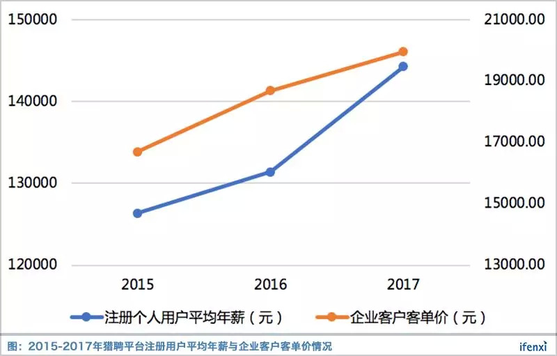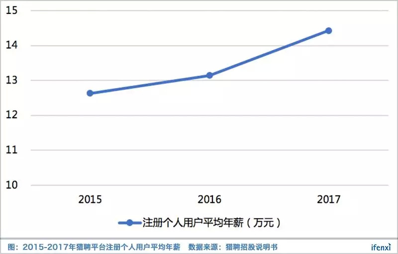 此外,猎聘的增长也体现在平台用户的平均年薪上。2015-2017年间,猎聘平台注册个人用户平均年薪呈上涨趋势,而最新的2018年中报显示,这一数字还在不断提高,并逐步突破15万元。