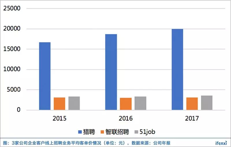 这帮助猎聘企业客户客单价一骑绝尘,达到20000元大关,且仍随着求职者的平均年薪逐渐提高,而51job与智联招聘的客单价则均停留在3000元左右。