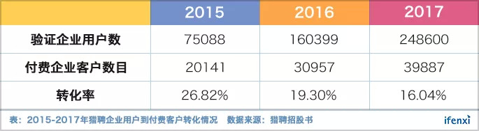 这使得猎聘企业客户客单价天花板相对较低。当下,猎聘企业客单价增长势头已初显疲态。同时,猎聘的付费客户的转化率也在不断降低。这意味着越来越多的企业用户将猎聘作为不同招聘平台的补充渠道。