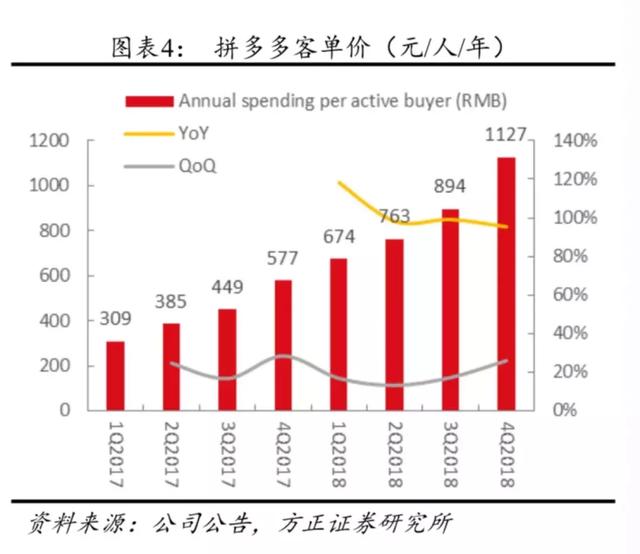 除了存留率这个直接指标来看,拼多多既有用户的消费频率在持续提升——平台活跃买家年平均订单26.56笔,较去年同期的17.55笔同比增长51%。与此同时,ARPU(每户平均收入)有所提升。根据财报,2018年拼多多活跃买家年度平均消费额达到1126.9元,而2017年同期为576.9元,尽管仍低于京东和阿里,但同比有 95%的增长 。