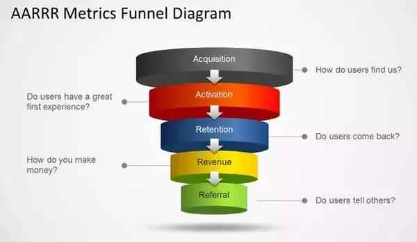 硅谷风投500starup的合伙人Dave McClure2007年提出了一种业务增长模型——“海盗指标AARRR”,包括用户获取(Acquisition)、用户激活(Activation)、用户存留(Retention)以及获取收入(Revenue)、推荐(Referral),硅谷许多产品经理和营销人员都把这个模型当作判断产品增长性的重要指标。这五个环节环环相扣,不断地循环和升级才能够保持产品的持久性的增长。