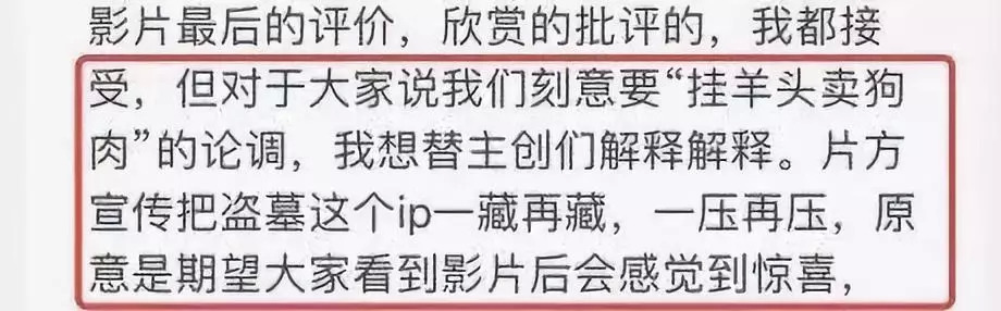 直到上映之后大家已经感觉到自己被欺骗时张伟的扮演者李佳航还不停的解释说片方在宣传时之所以会对盗墓这个IP“一藏再藏,一压再压”是期待大家看到影片后感到惊喜。