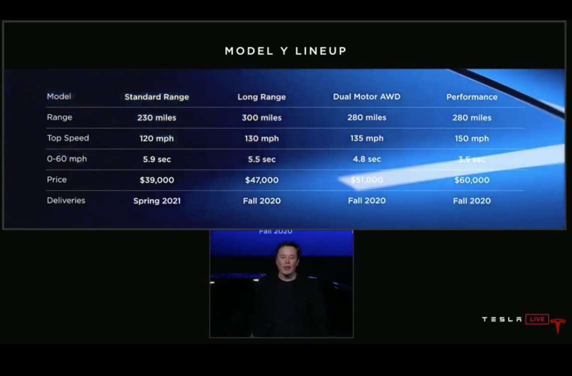 此次 Model Y发布了4个版本。标准续航版(Standard range)续航230英里,最高时速120mph,0-60mph(0-96km/h)加速5.9秒,售价39000美元(约合26.2万元)。