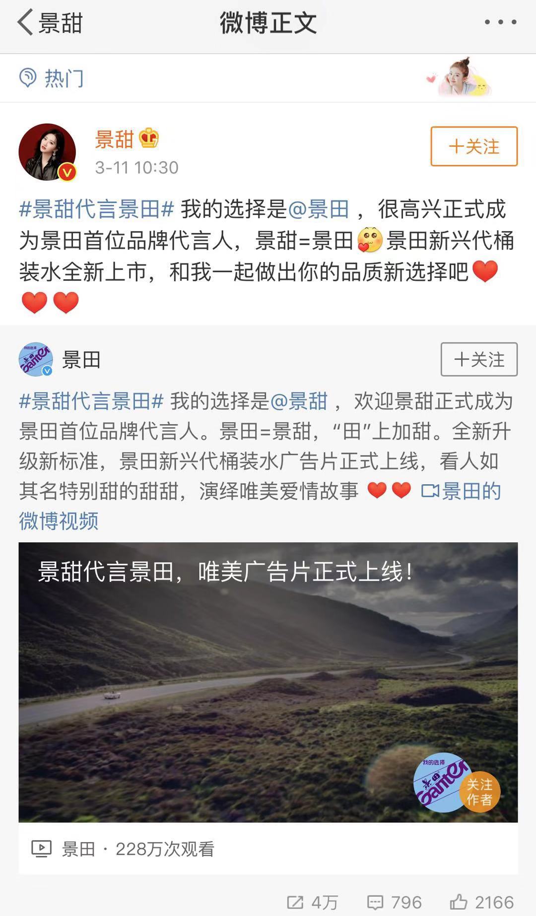 “欢迎景甜正式成为景田首位品牌代言人。景田=景甜,‘田’上加甜。”景田的品牌微博在3月11号发布了这样一段绕口令一样的官宣。