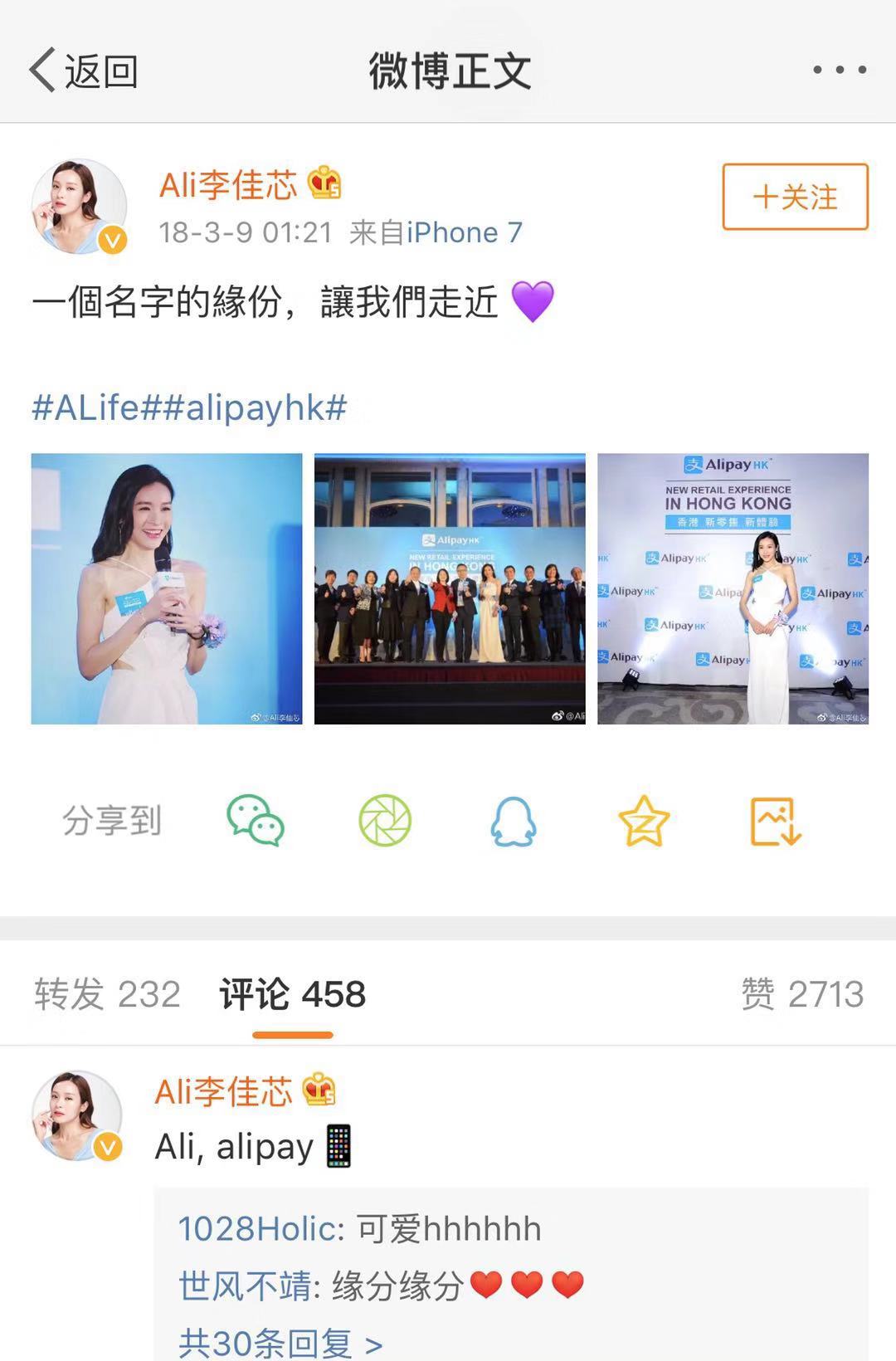 当然,也有品牌借助名字相似的代言人来拓展市场。譬如支付宝在香港的推广过程中,找来了TVB女演员李佳芯来代言,就是因为她的英文名字“Ali”和支付宝Alipay刚好契合,引发了代言人和品牌之间的记忆关联。