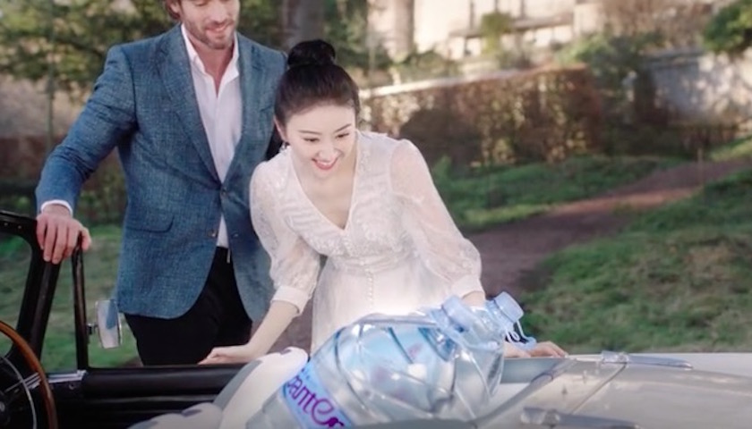 同时还有一段视频广告,依旧是这个品牌以前常见的“欧洲古堡风”,以及让人有点摸不着头脑的情节——在树上的景甜被车里的两大桶装水景甜吸引,好像比看到来约会的男友还开心。