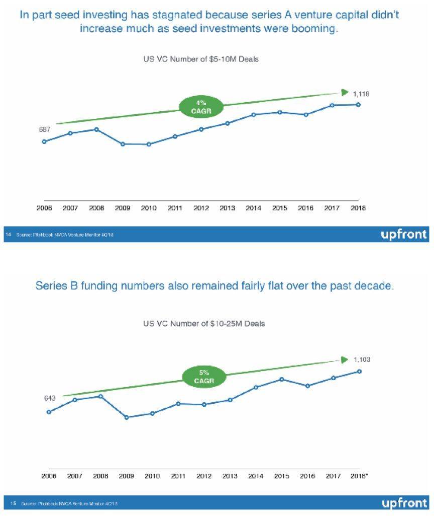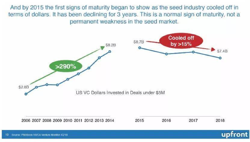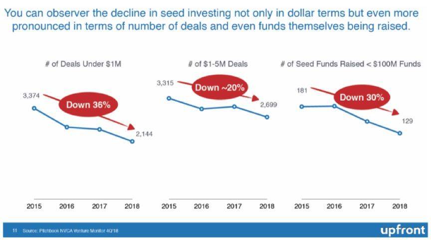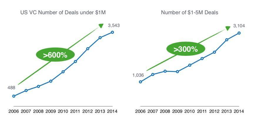 Mark及团队的统计和调研发现,“在美国,那些针对初创公司、融资额在500万美金以下的早期投资市场,过去三年中一直呈现下滑——无论从机构数、资金量和交易数量来看都是。”