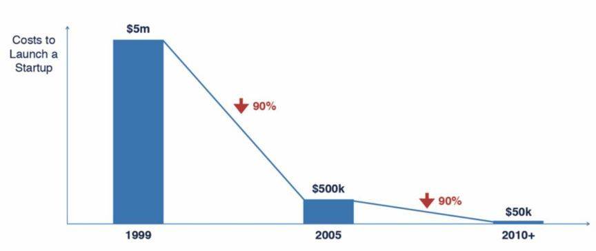 巨大的科技进步,让创办一家新公司的成本变得前所未有地低。主要有两次变革,第一次是1999年,开源计算和平行计算的进步,让企业在系统、服务器和数据库上的成本大大降低,一度让创业成本降低了90%;第二次是2005年,亚马逊云计算服务的出现,再次降低了创业成本。