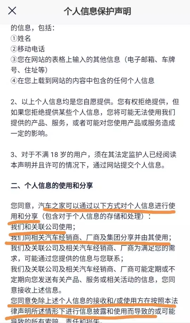 除此之外,条款称“您同意,汽车之家可以通过以下方式对个人信息进行使用和分享:我们和关联公司使用;我们向相关汽车经销商、厂商及集团分享并由其使用;我们及关联公司及相关汽车经销商、厂商为满足您的需求,可能通过您提供的信息与您联系……”