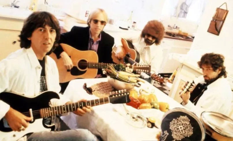 从左到右 George、Electric Light Orchestra 的 Jeff Lynne、Tom Petty、Bob Dylan,1988年他们在洛杉矶 Bob 家里录制 George 的 《Handle with care》 ,George 手里的就是那把著名的 Amp in Case(琴盒中的有一个五瓦的小音箱,可以随时演奏)