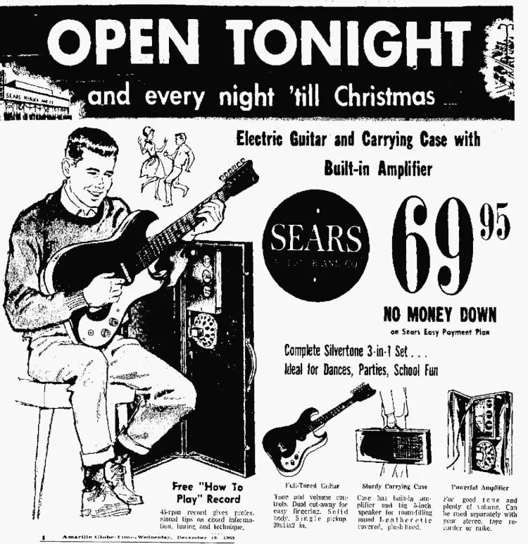 Silvertone 是他们在1915到1974年成立的一家经营乐器、播放设备的子公司。在1915年,Sears 紧跟时代潮流,开始售卖留声机。到了摇滚乐兴起的1950、1960年代,Silvertone 终于把手伸向了吉他和吉他音箱。