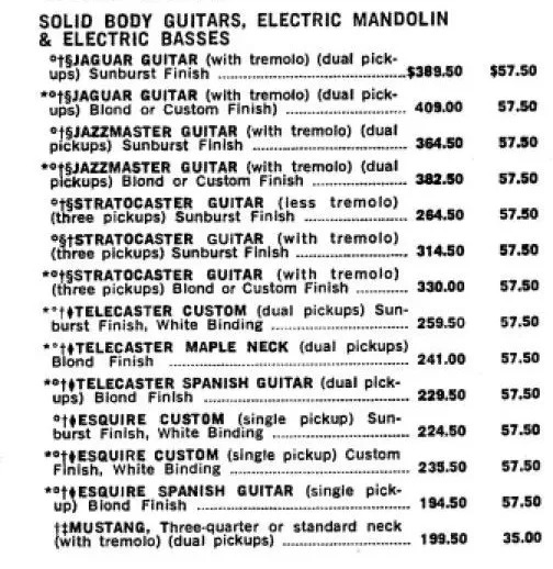 上图是1967年 Silvertone 的海报,三合一 69.88刀。而再上面一张1968年 Fender 的报价中,第一列是吉他价格,后一列是琴盒子的价格。一把 Fender 吉他加吉他盒子,最便宜的 Mustang 也要235刀,而 Jaguar 则要几乎450刀,还不算音箱。