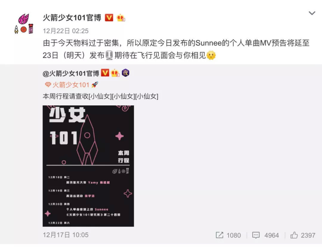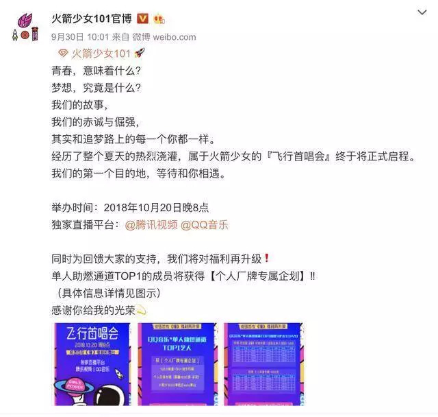 同样类似的事件并非是第一次发生,早在去年10月份的时候,哇唧唧哇在公司的官博中承诺,将会给在QQ音乐数字专辑《撞》个人单链中销量最高的艺人提供个人厂牌专属企划奖励,其中包括火箭少女101演唱会中的个人solo舞台。