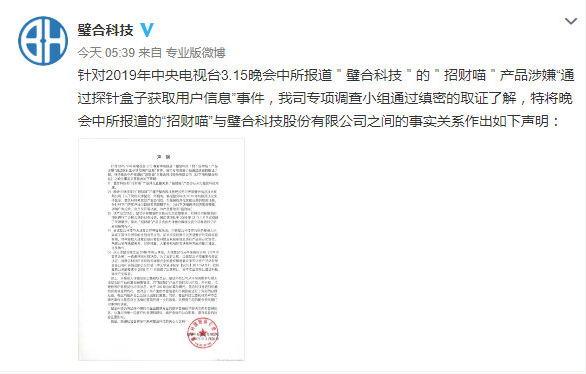 针对央视3.15晚会中所报道"璧合科技"的"招财喵"产品涉嫌“通过探针盒子获取用户信息”事件,璧合科技今早发布声明称,璧合科技和“招财喵”产品并无直接关系,“招财喵”产品亦从未归璧合科技所属,公司系财务投资,“招财喵”归属于璧合科技曾经投资的天津璧合所拥有。虽然璧合科技与天津璧合存在股权关系,但是璧合科技作为财务投资人已完成了其作为股东的全部出资义务,却并未实质参与过天津璧合的实际经营管理。