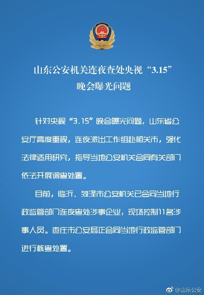据山东公安官方微博,针对央视“3.15”晚会曝光的问题,山东公安机关连夜查处涉事企业,现场控制11名涉事人员,以下为通报全文: