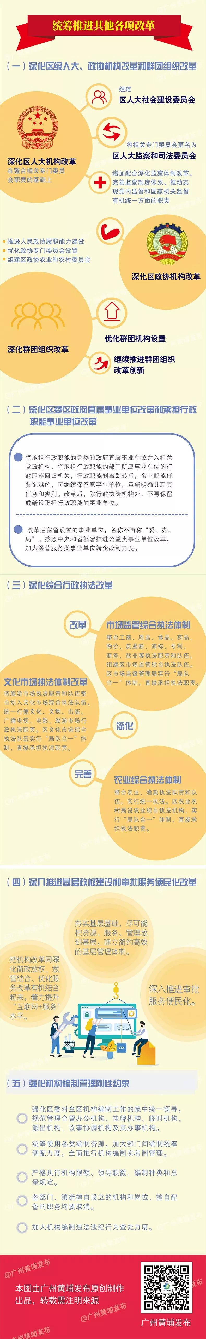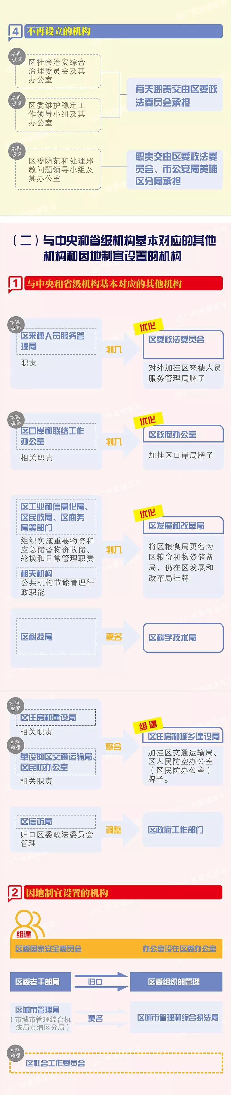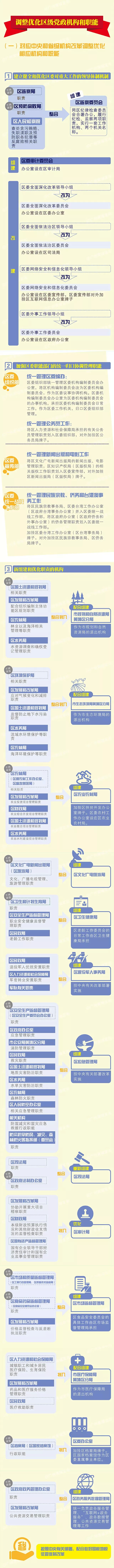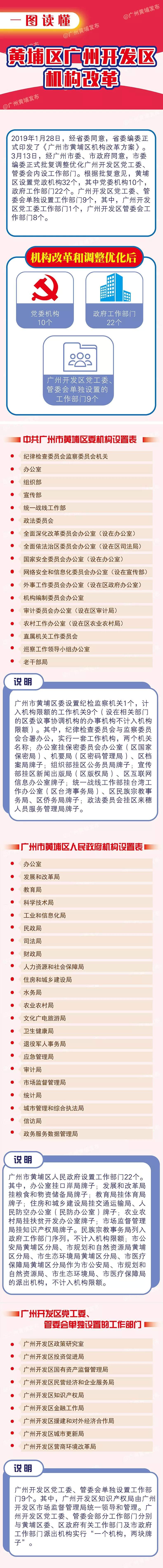 本次机构改革,黄埔区、广州开发区在确保中央、省、市明确的区级机构改革“规定动作”不走样的基础上,在行政区与功能区融合互动发展的制度框架基础上再谋新突破、再造新优势,强有力地支撑粤港澳大湾区“四区四中心”建设。如结合招商引资、优化营商环境等实际需要,设立了营商环境改革局、援建和对外经济合作局等特色部门。