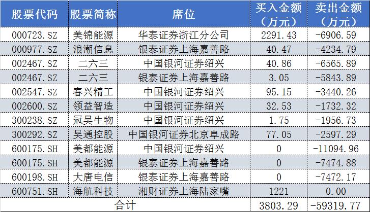 当日赵老哥卖出金额最大的为美都能源(600175.SH),旗下两个营业部中国银河证券绍兴、银泰证券上海嘉善路包揽该股龙虎榜卖方前两位,合计卖出金额高达18569.84万元。