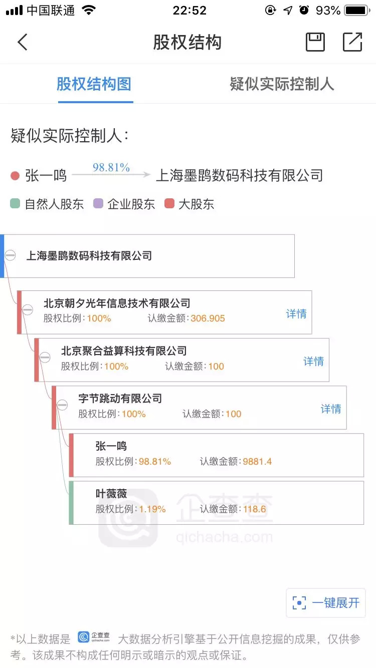 根据该公司在企查查的更新消息显示,目前上海墨鹍数码科技有限公司(下文称“上海墨鹍”)的法定代表人已改为今日头条的高级副总裁张利东。从上海墨鹍现有的股权结构来看,字节跳动有限公司已经成为上海墨鹍的控股公司。