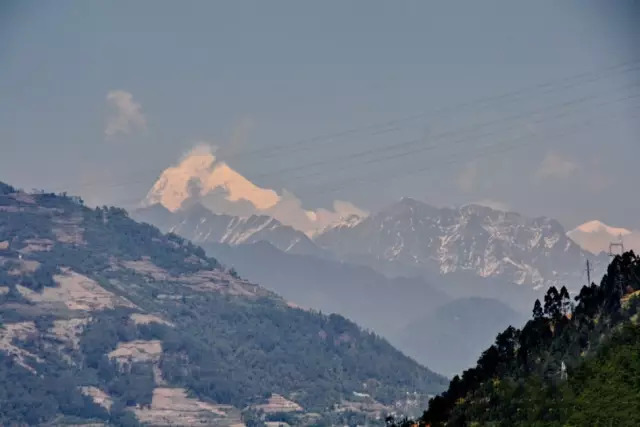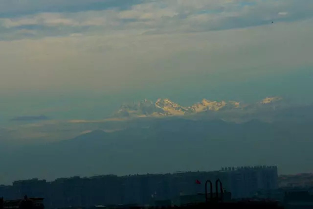 因贡嘎山距离较远,且有其他山峰遮挡,目前暂未有在市区内看到贡嘎山的记录