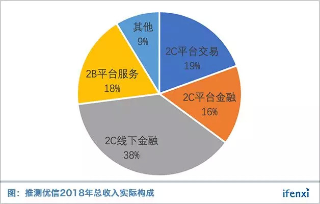 由此可以推算,优信2018年全年的金融成交量中,有近71%都是线下金融成交,且这种状态从2016年开始从未改变。线下金融对优信的收入贡献率高达37.9%,这才是优信的第一大收入来源。金融服务收入在其2C收入中占比达73%,接近易鑫的75%。无论从收入结构,还是从实际业务模式判断,优信都更加接近于汽车金融公司。