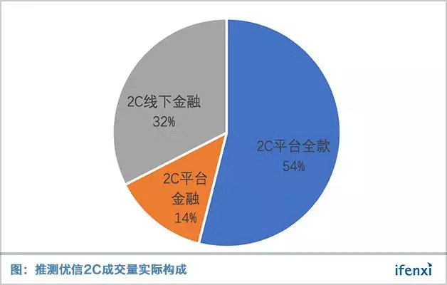 将2C成交量和金融成交量相减,可以得出其全款成交量。假设实际金融渗透率为20%,可以推测出实际平台交易量和实际的2C交易服务费水平,接近2B服务费水平,平均费率2.4%,也符合调研得出的1%-3%的市场正常费率。