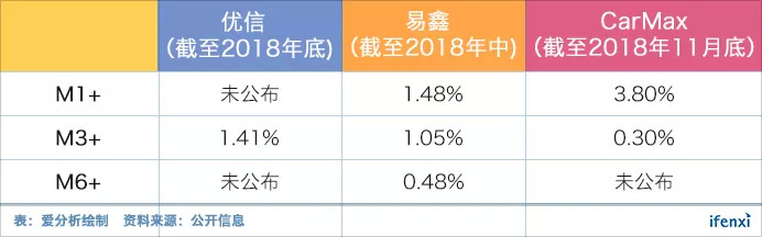 金融服务公司在技术投入上的不足将直接反映在风控能力上。二手车金融比新车金融在风控上要求更高,不仅要把控借款者的风险,还需要控制车辆本身的风险和经销商的风险。虽然优信表示其开发了一系列车辆检测工具和AI数据系统,但从其逾期表现来看,风控能力并不突出,M3+逾期率比易鑫和CarMax都高出一截。