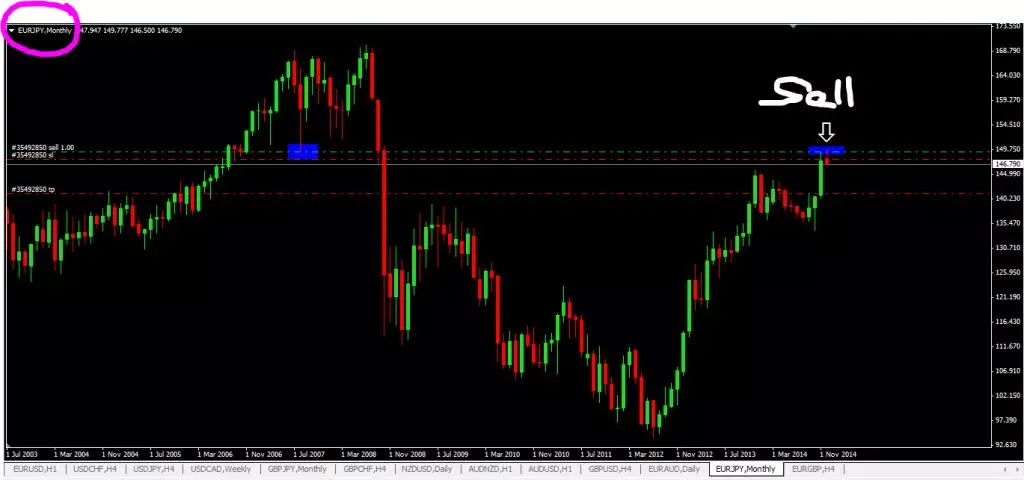 下面是以前我找到的一个EURJPY月图中的高胜算交易设置机会: