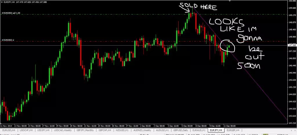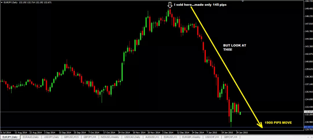 38天内欧元/日元下跌了1900点!!太尼玛糟心,要不是我太蠢,那一笔交易我能在一个月赚大发了。这次我得到一个教训:在较大时间框交易和在小时间框交易的方式是截然不同的。