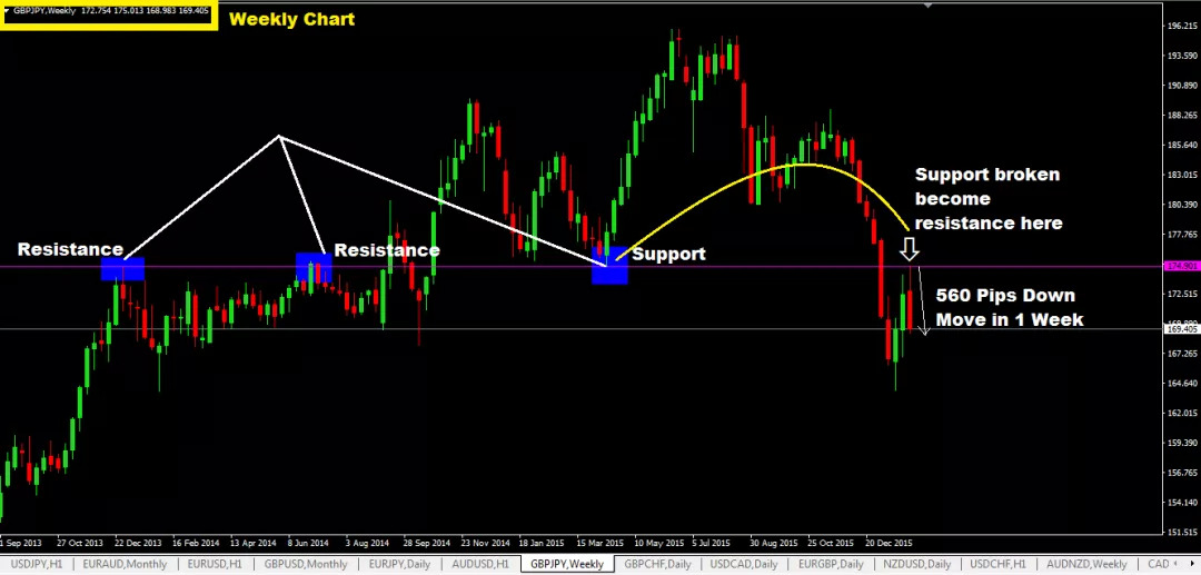 以下是我给大家举的一些例子,看看在大时间框内价格如何在支撑位和阻力位做出反应。
