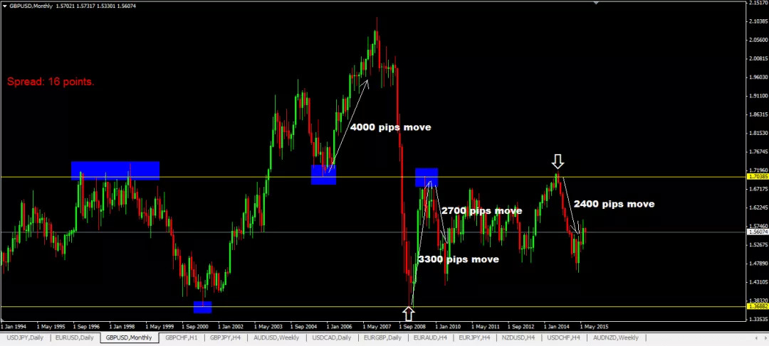 下面是GBPUSD的月线图,需要指出两点: