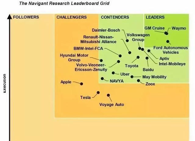 当然这并不是说,榜单有偏袒实力雄厚的传统老牌车企,毕竟在去年还被放在“领导者”层的戴姆勒-博世联盟、大众集团、宝马-英特尔-菲克联盟、雷诺-日产-三菱以及Aptiv(安波福,德尔福拆分后的公司),在今年也已经下滑了一个阶层,到了“竞争者”圈。可见,一切成绩还是靠综合实力说话。