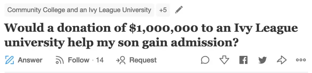 让人更震惊的是,在美国除了这些违法手段,正儿八经的花钱还真的能不能把孩子送入藤校呢?Quora上也有人问过同样的问题“捐100万美元给藤校能不能让我儿子入学?”