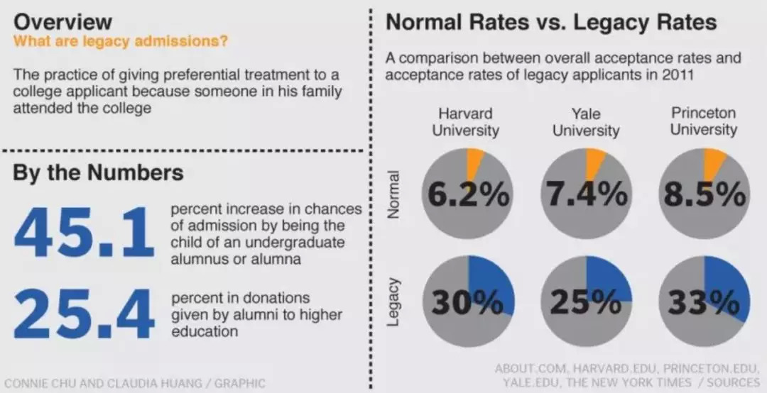 申请对象的家庭中有申请学校的毕业校友,比如如果你的父母是哈佛的毕业生,你的录取概率会大大高于父母没有读过哈佛的申请者。这种录取方式直白的说就是“拼爹”。