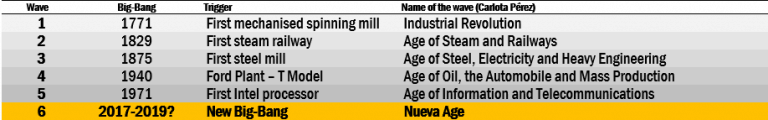 “240年来,人类共发生了五次技术革命……每一次技术革命都推动了发展的大潮,并影响了半个多世纪的增长。”在每个循环中,我们都可以观察到相同的一般形状。